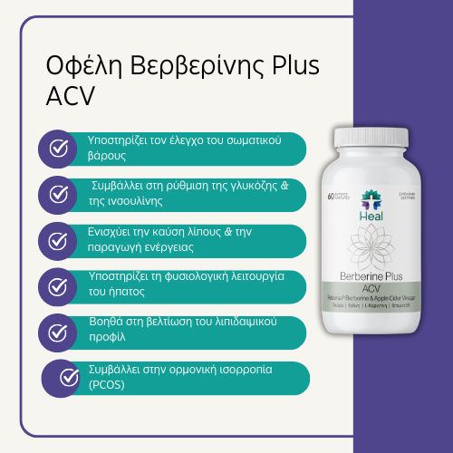 Το Berberine Plus ACV είναι ένα φυσικό συμπλήρωμα διατροφής που υποστηρίζει τη μεταβολική υγεία, τον έλεγχο βάρους και την ορμονική ισορροπία.