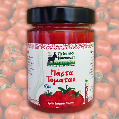 Αγνή, πλούσια και αρωματική!  Η Πάστα Τομάτας Πράσινο Μονοπάτι παρασκευάζεται από ώριμες, βιολογικές τομάτες ελληνικής καλλιέργειας και δεν περιέχει καθόλου προσθήκη αλατιού. Έτσι διατηρεί τη φυσική γεύση και τη γλυκύτητα της τομάτας, αποτελώντας ιδανική βάση για κάθε σπιτική συνταγή.
